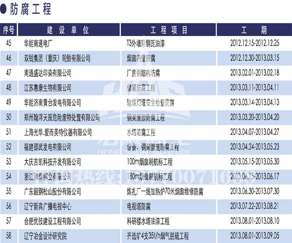 宏順建設工程有限公司是國家批準成立的專業高空作業企業:承攬過(國內.國外)煙囪新建、煙囪防腐、吊機防腐、水塔防腐、管道防腐、龍門吊防腐、儲存罐防腐、煙囪內壁防腐等高空作業工程。具有“不搭腳手架 、 不需要停產”施工特點。